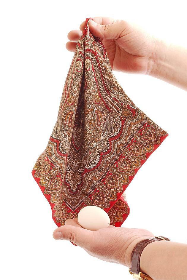 日本古典マジックのひとつに和妻の『袖卵』があります。 しかし洋服で演じるわけにいきません。しかも形式を重んじる和妻は手順や仕草の難しさもあり、近年は見かけることが少なくなりました。 そこで様式にとらわれることなく演じられる『エッグプロダクションスカーフ』を製作いたしました。1枚のスカーフから4個の卵が現れます。付属の卵は中空の本物です。 下部の詳細写真はゴーンスカーフのものです。