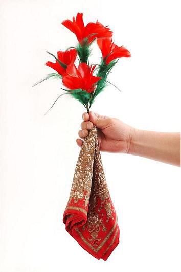 一輪の花をスカーフから取り出すものは数多く存在しいています。ほとんどの製品は花を隠しているスカーフの四隅が膨らみ「やはりあそこから引き出したのか・・・」と観客に察知されて種明かしを見せているようなものでした。 当社のスカーフは膨らみを全く感じさせる事なく、3輪の豪華な花を2本も取り出すことができるのです。 フラワースカーフの認識が変わるでしょう。